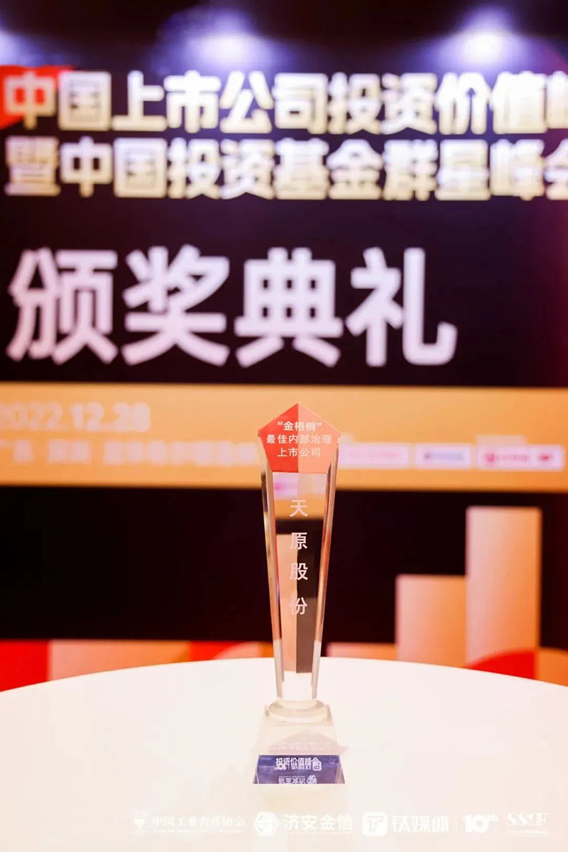 12月28日,2022年中國上市公司投資價值峰會暨中國投資基金群星峰會在深圳舉行,在“雙峰會”上重磅發(fā)布了中國上市公司投資價值“金梧桐”獎評選,天原股份憑借高質(zhì)量的內(nèi)部治理與管理能力,榮獲“金梧桐”最佳內(nèi)部治理上市公司獎。